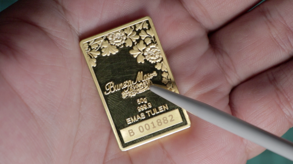 Emas ini unik, kerana ia terdiri dari sekeping gold bar 50g yang boleh dipatah-patahkan kepada kepingan 1g.