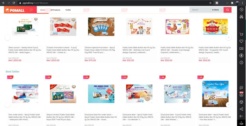 Di PG-Mall kita boleh shopping online untuk barang² biasa di platform online shopping yang lain, beli gold bar dan dinar, malah barang kemas.