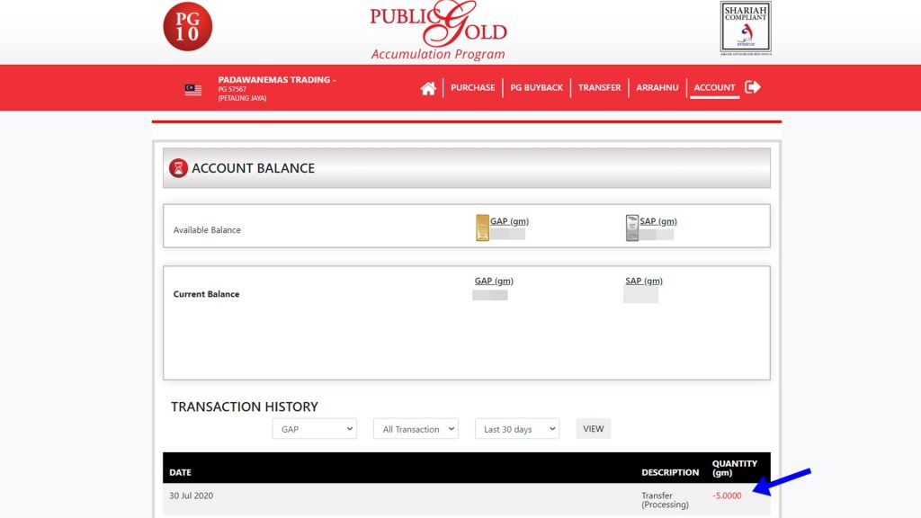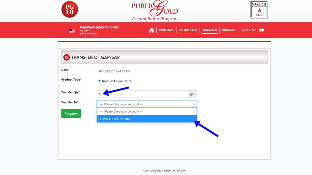 Login masuk ke website Public Gold, dan terus ke bahagian GAP. Klik pada “Transfer”