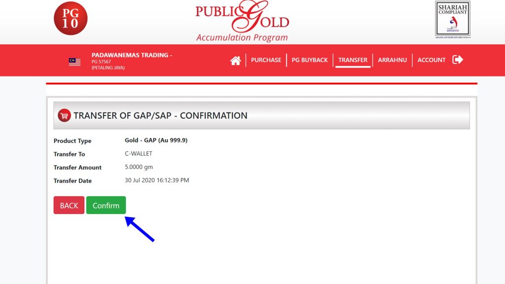 Masukkan jumlah gram yang mahu transfer (jual semula) dari akaun GAP ke C-Wallet. Di bahagian “Transfer To”, pilih “C-Wallet”