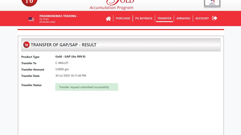 Mungkin ada yang tidak tahu, kita sebenarnya boleh transfer (jual emas) dari akaun GAP ke C-Wallet dalam PG Mall