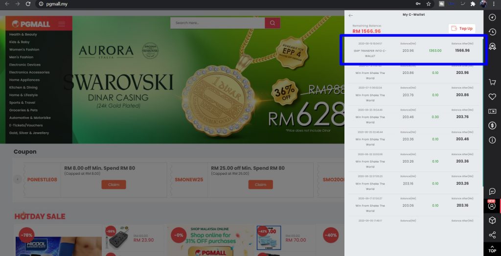 Duit dalam C-Wallet ini seterusnya boleh digunakan untuk sebarang belian di PG Mall.