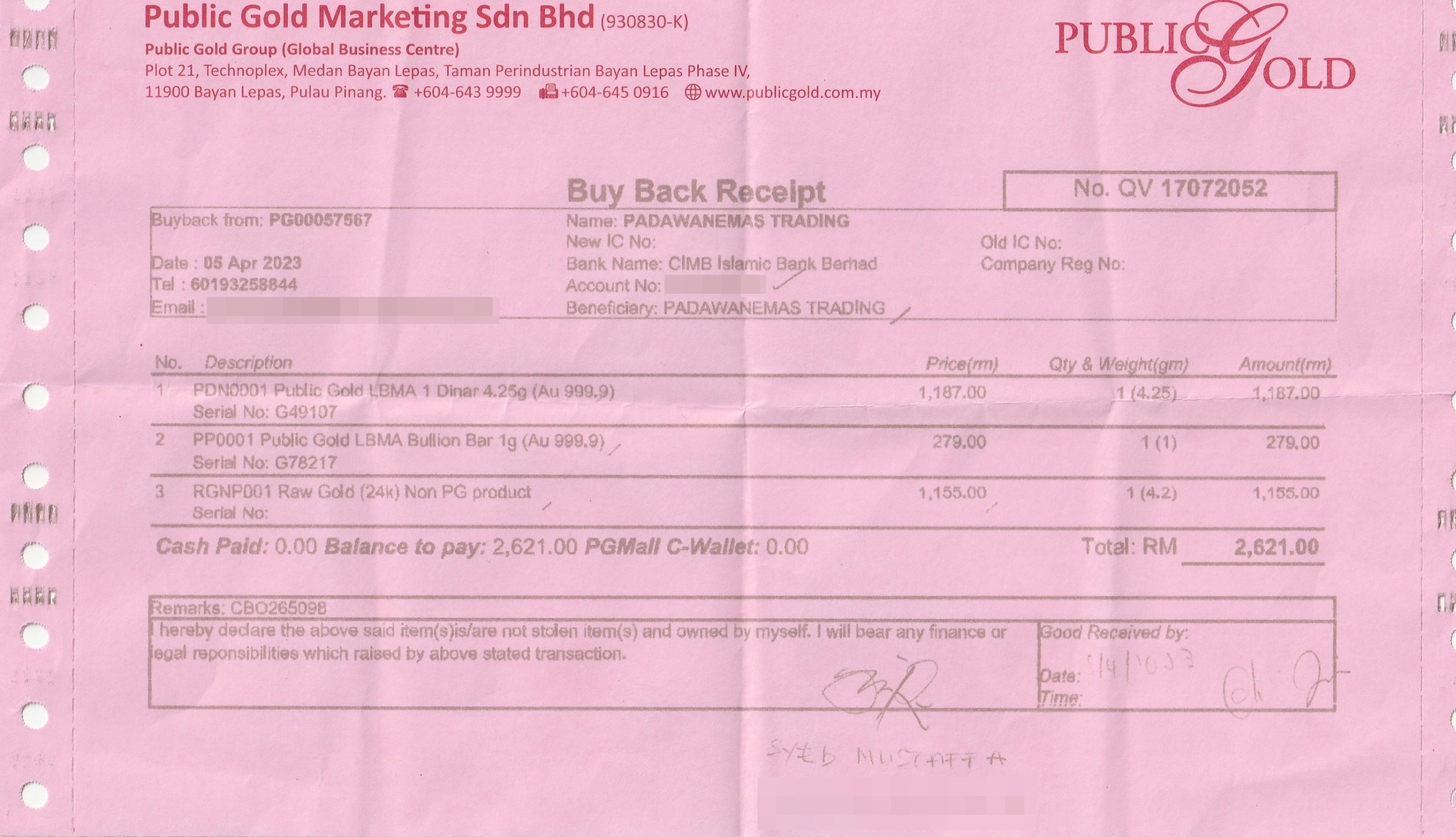 Ini pula invois dari Public Gold, hasil jual semula emas² tadi;