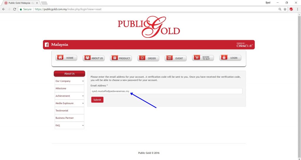 1. Di page seterusnya, anda hanya perlu memasukkan email berdaftar dengan Public Gold. Satu email akan dihantar beserta link pengesahan. Ikut langkah² di dalam email tersebut untuk menukarkan kata laluan baharu.