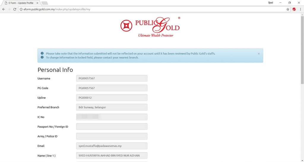 1. Anda akan dibawa ke page kemaskini butiran peribadi. Ada beberapa maklumat yang tidak boleh dikemaskini sendiri, ini anda perlu menghubungi terus mana² cawangan Public Gold.