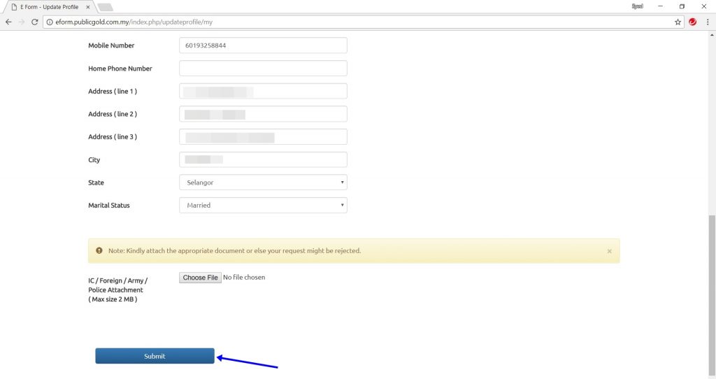 1. Setelah berpuashati dengan kemaskini maklumat, klik butang “Submit“. Staff Public Gold akan membuat semakan dan email status kemaskini (berjaya atau tidak)
